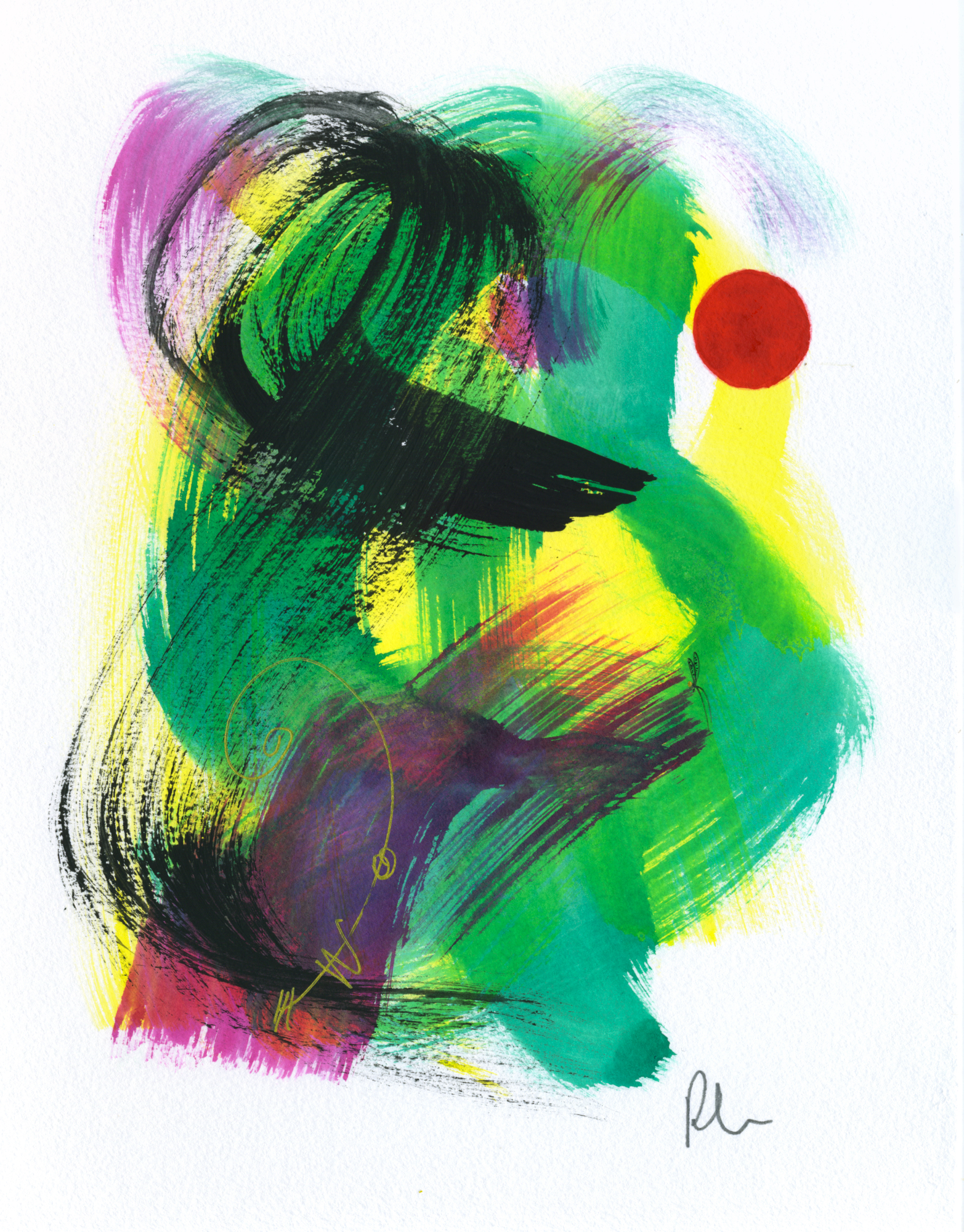 I started this piece last week while the power was still out in our house. I set up at a table using outside daylight as a light source. Instead of quickly finishing the piece like I always do, I decided to do the background and let it sit for a day or two while we were still dealing with all the crazy conditions: cold, no power, water restrictions, etc. After a couple of days, I added the black brush stroke using a new black paint that absorbs almost 99% of light. It’s like looking into a black velvet void, pretty awesome and very appropriate for the week we had. Next, I added a red sun which decided to come out on Friday and started to warm up our neighborhood and melt the frozen trees, which were raining ice on us that day. Finally, over the weekend I added some small gold touches as things around us started to settle down and life was beginning to feel like normal again. I still let the piece sit for a couple more days taped up on my table as though it needed some time to settle down, too.